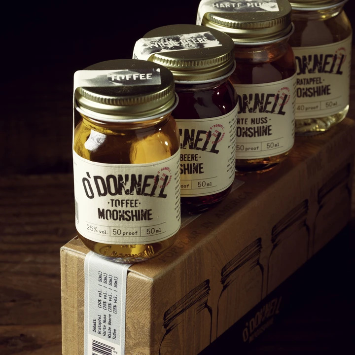Das beliebte O'Donnell Moonshine Design in Miniaturgröße: 4 kleine Mason Jars, 4 verschiedene Geschmacksrichtungen, 4 x absoluter Genuss! Nach der Tradition der Gangster während der amerikanischen Prohibition hergestellt.